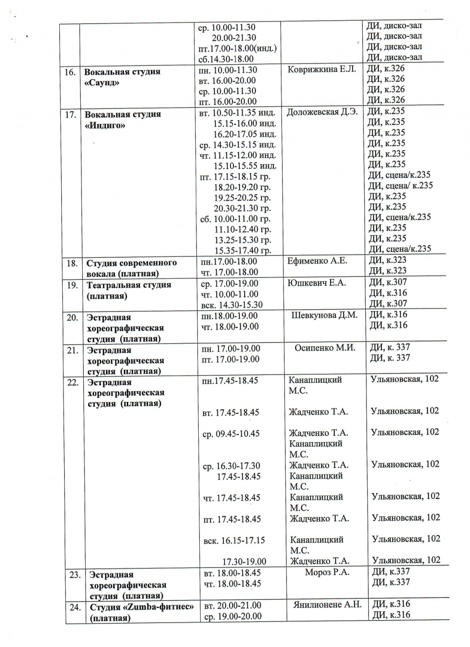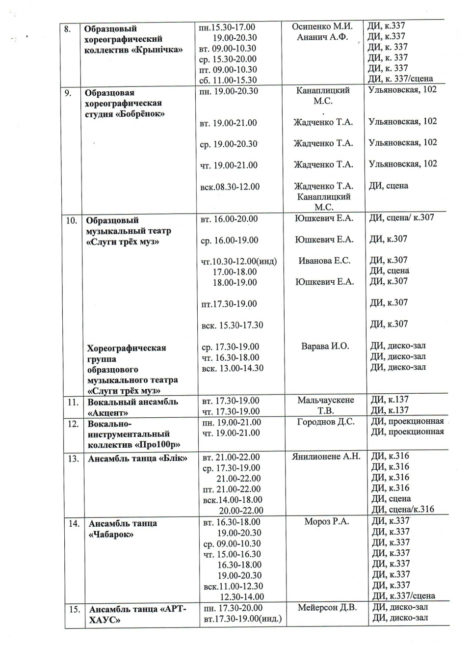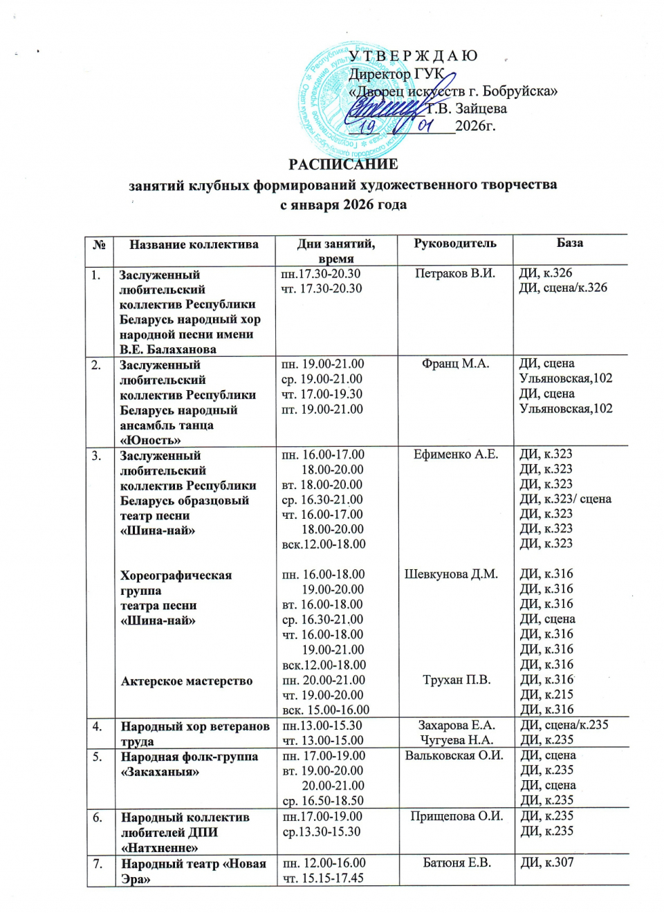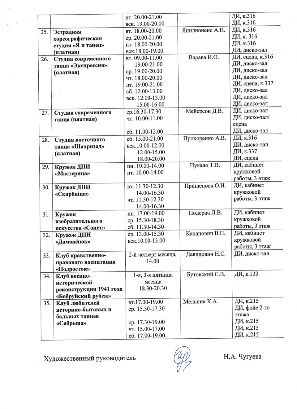 занятий клубных формирований художественного творчества,